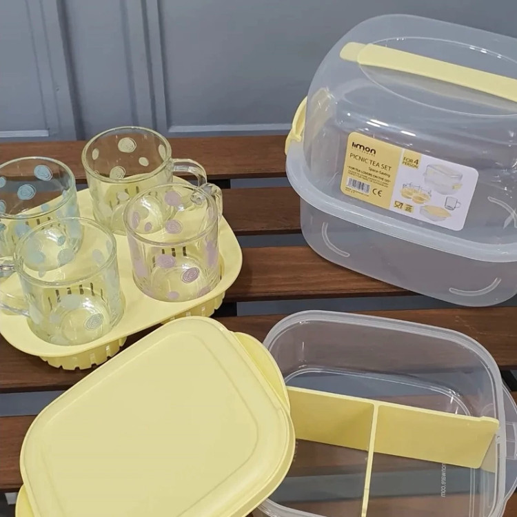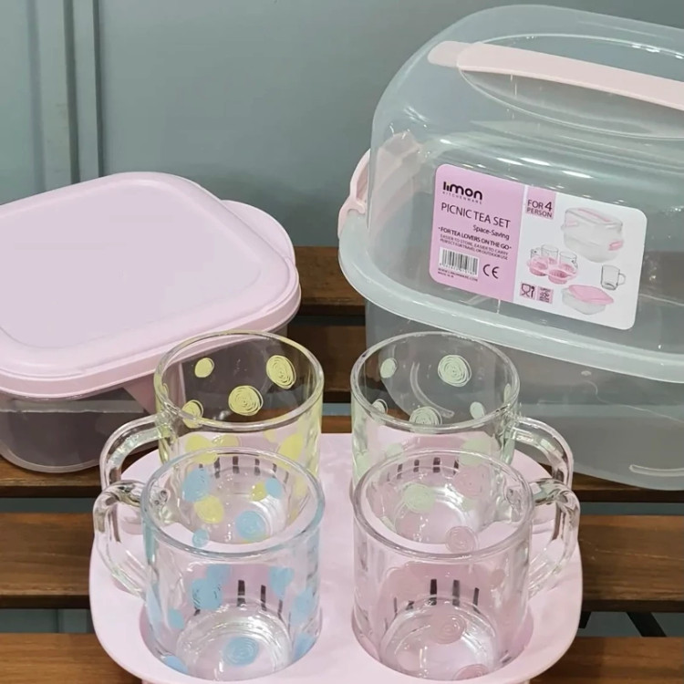 دارای 4 لیوان دسته دار و سینی جالیوانی و یک ظرف دربدار چند قسمتی