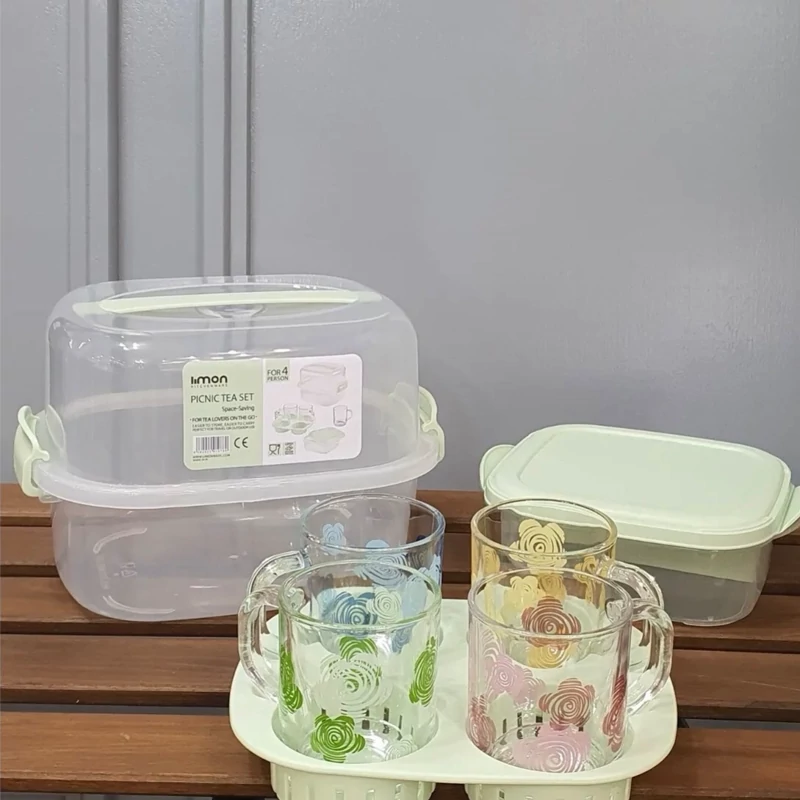 دارای 4 لیوان دسته دار و سینی جالیوانی و یک ظرف دربدار چند قسمتی