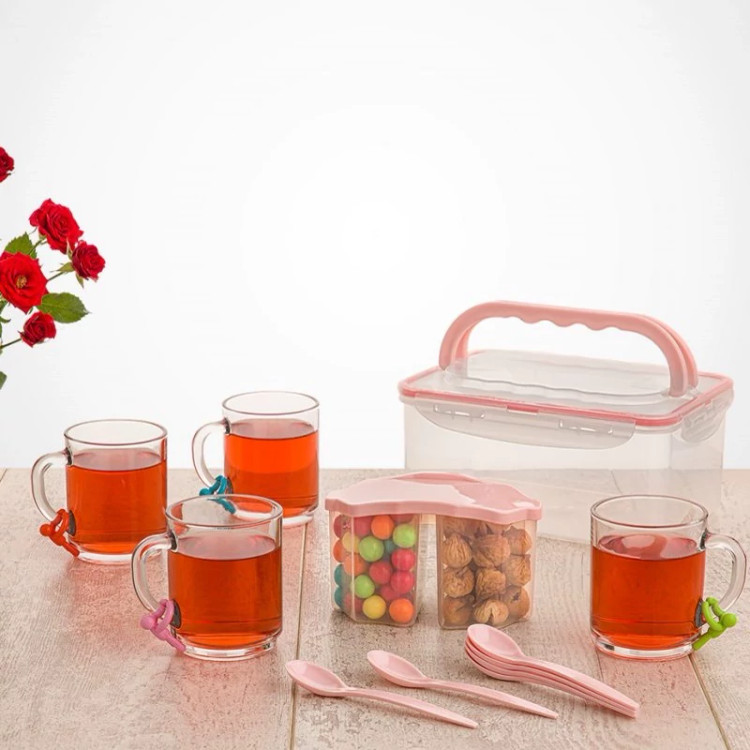 4 نفره دارای 4 لیوان و یک ظرف دردار دو قسمتی برای قند و پولکی